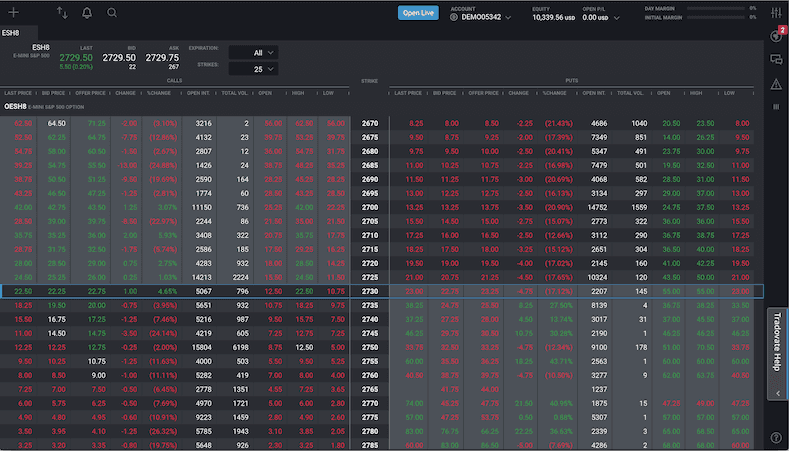 Tradovate’s option chain allows traders to quickly view both puts and calls for all strike prices and expirations for an underlying futures contract. Trade options quickly and efficiently.