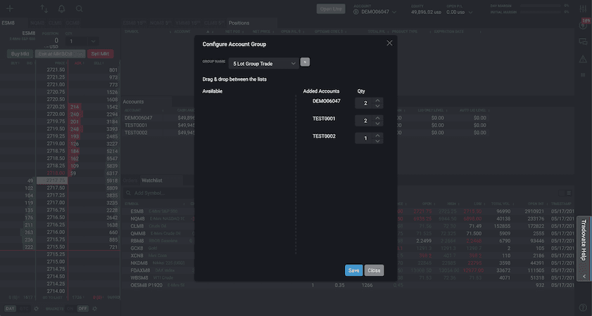 Tradovate’s Group Trade allows traders who trade multiple accounts to define unlimited groups, add accounts to those groups, and assign quantities to the accounts in the group. Traders can then select one of their configured groups and place a trade for all the accounts in the group easily through Tradovate. Orders, Positions and Accounts for the group are displayed right inside Tradovate and can be managed independently.